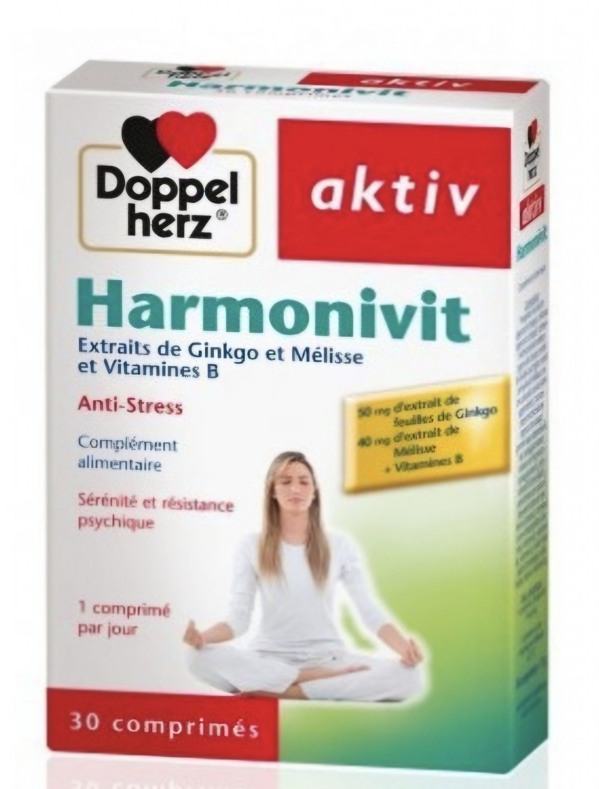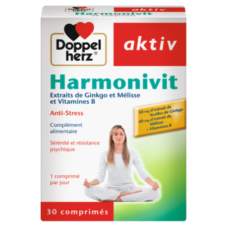 Harmonivit® est une combinaison dextraits de ginkgo, de mélisse et de vitamines B qui aide à mieux surmonter le stress de la vie quotidienne. Grâce à sa formule à base de plante, il soulage l’anxiété et réduit les troubles du sommeil Sans lactose ni gluten.